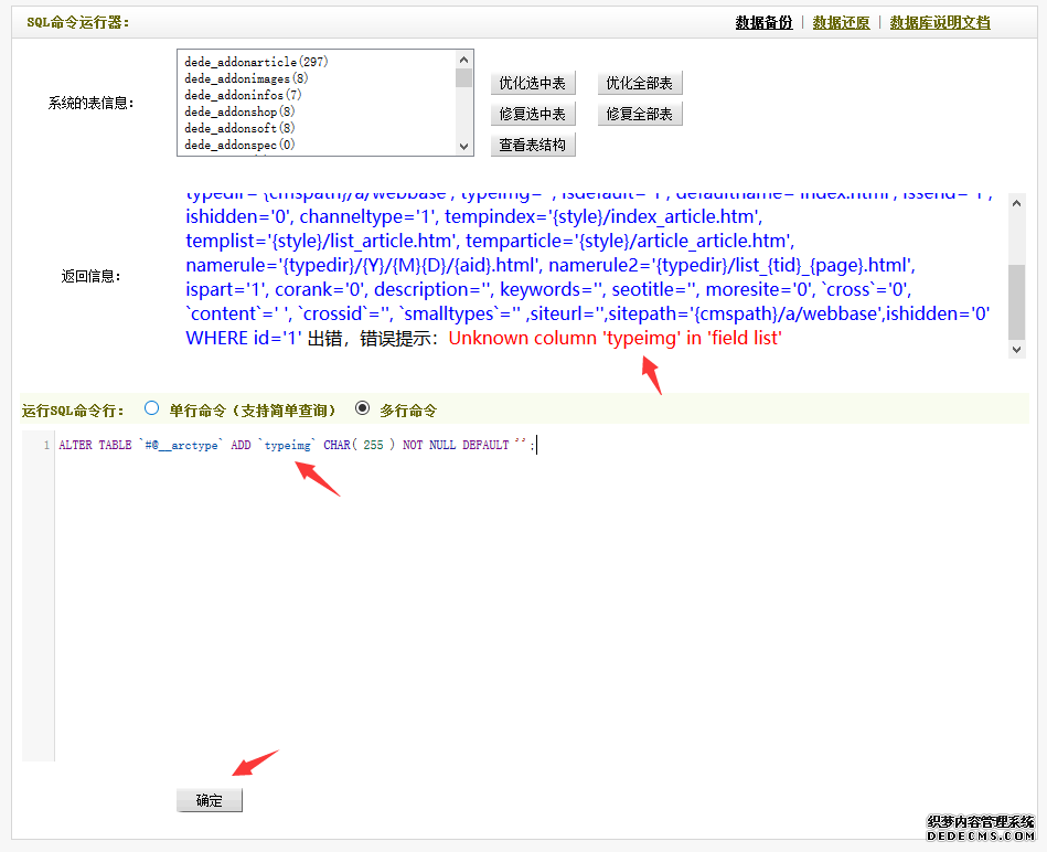 注意:上面SQL语句中的typeimg改成你错误提示里的字段名称,如果是缺少多个字段,就执行多条上面的SQL语句。