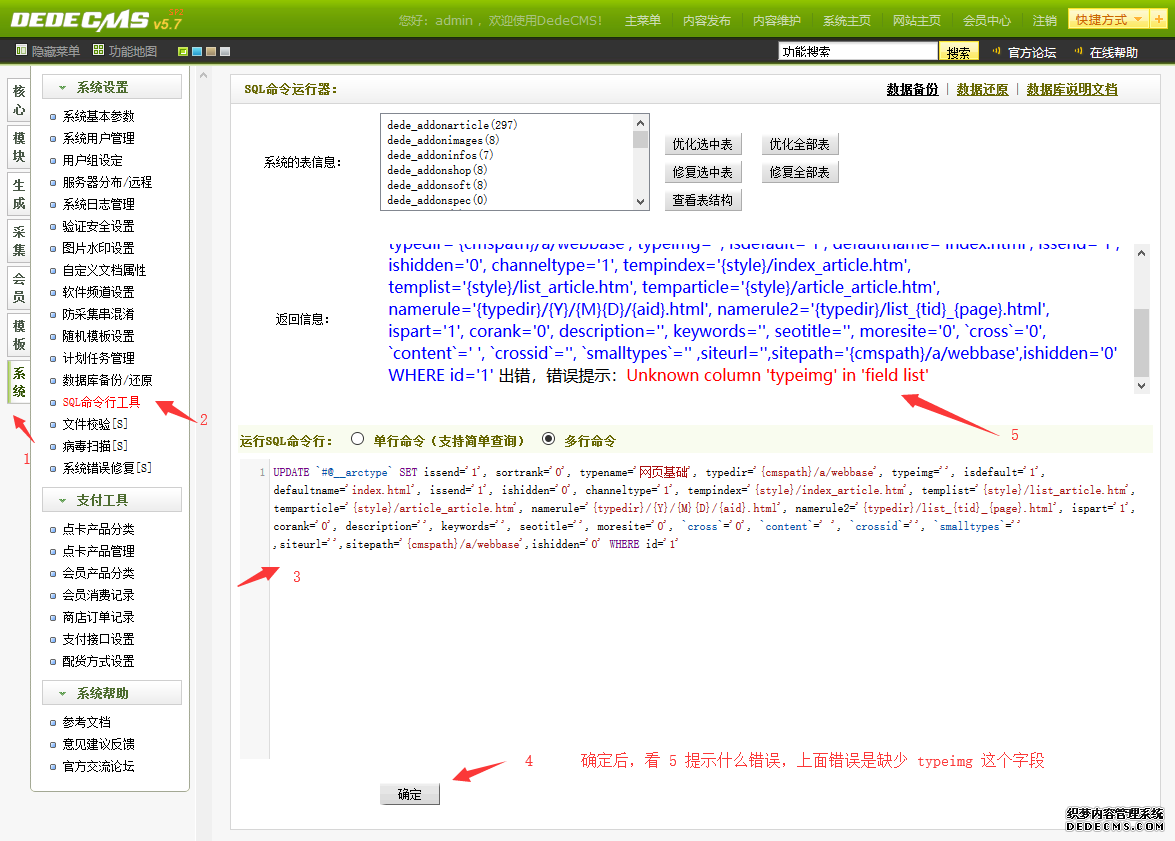 把复制到的语句到后台-系统-SQL命令行工具,执行,看执行结果提示什么错误