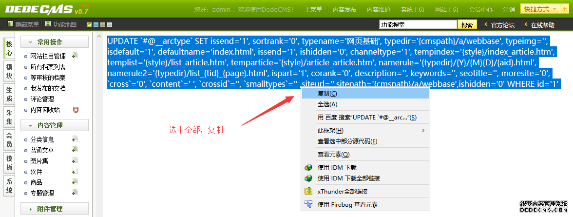 2、保存后,继续去编辑修改某个栏目,看页面输出的代码,全选,复制